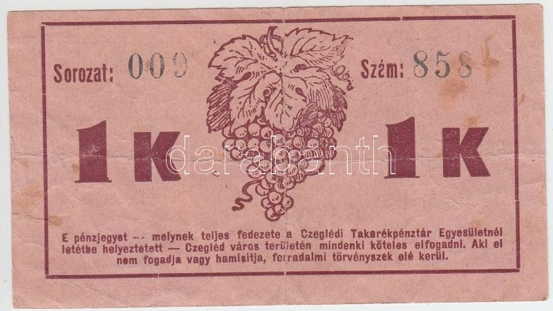 Leírás: Cegléd 1919. 1K városi pénz T:III