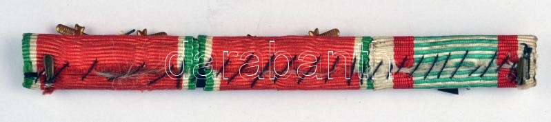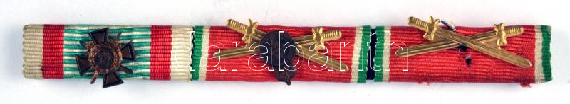 Leírás: ~1940. 3db szalagsáv: Magyar Koronás Bronzérem hadiszalagon kardokkal kitüntetés 2db szalagsávja,egyik miniatűrrel, másikról hiányzik + Tűzkereszt I. fokozata kitüntetés szalagsávja miniatűrrel T:2