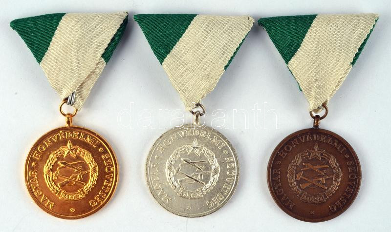Leírás: ~1950. "Magyar Honvédelmi Szövetség - Honvédelmi Lövészverseny - Korcsoport Verseny Döntő" arany, ezüst és bronz fokozatú kitüntetések szalaggal T:2
