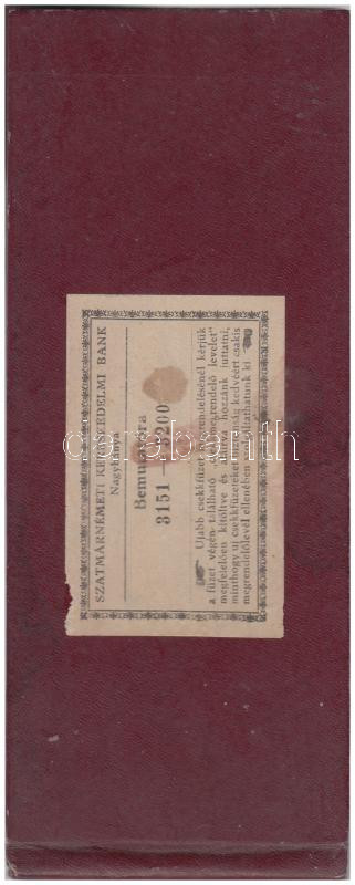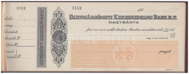 Leírás: Szatmárnémeti Kereskedelmi Bank Nagybánya csekkfüzete egy kitépett csekkel, amúgy kitöltetlen