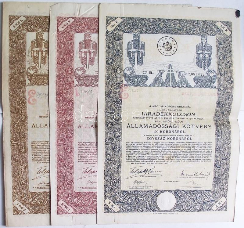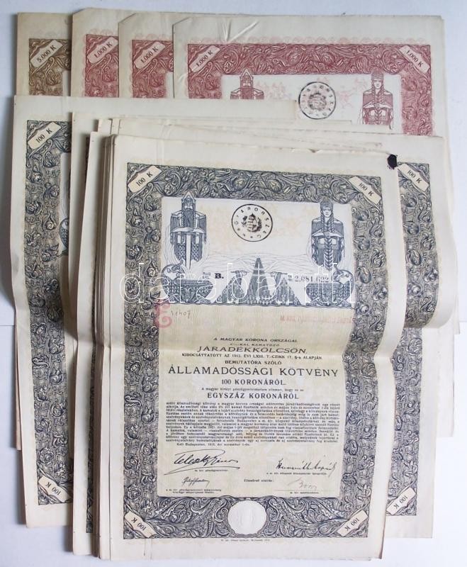 1916. A Magyar Korona Országai 6%-kal kamatozó Járadékkölcsön- államadóssági kötvénye 100K-ról szelvényekkel, fekete "Magyarország" körbélyegzővel (34x) + 1000K-ról (4x) + 5000K-ról (1x), összesen 39db! Jó állapotban.