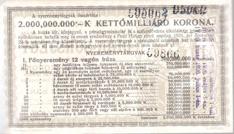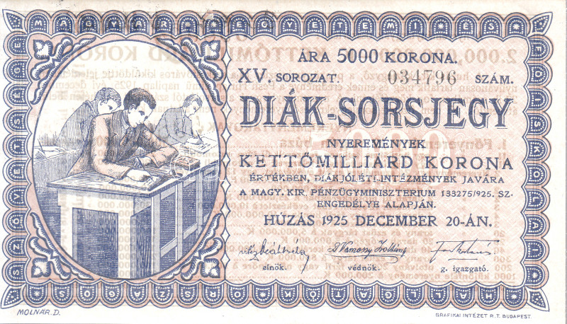 Leírás: 1925. "Diák sorsjegy" XV. sorozat 5000K T:I-