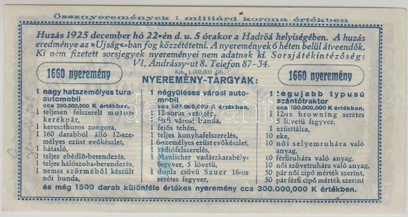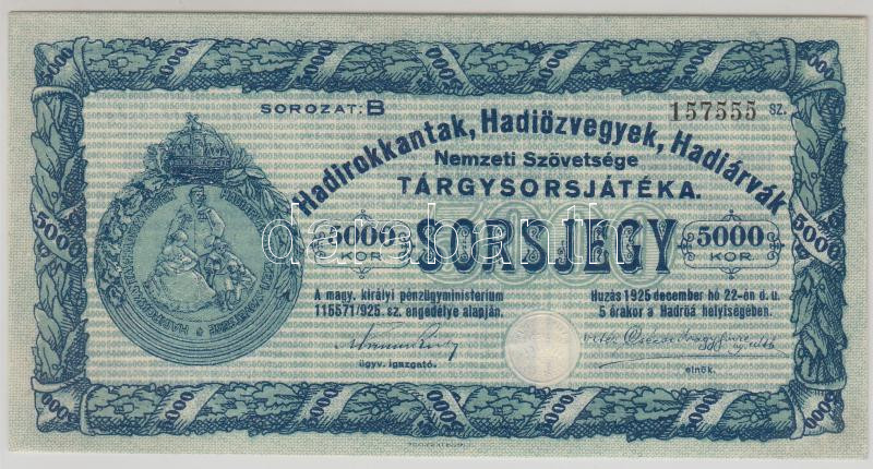 Leírás: 1925. Hadirokkantak, Hadiözvegyek, Hadiárvák Nemzeti Szövetsége Tárgysorsjátéka-sorsjegy 5000K T:I-