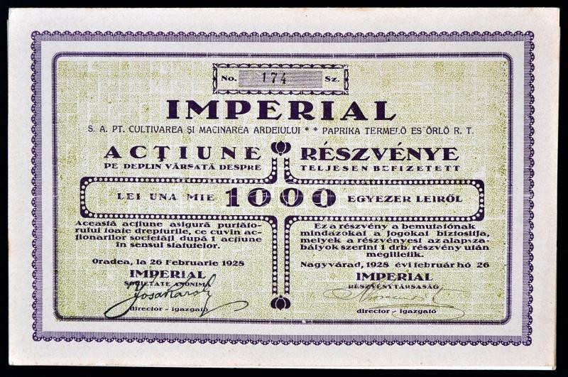 Leírás: Nagyvárad 1928. Imperial Paprika Termelő és Őrlő R.t. részvénye 1000L-ről szelvényekkel