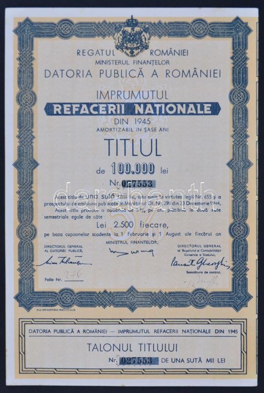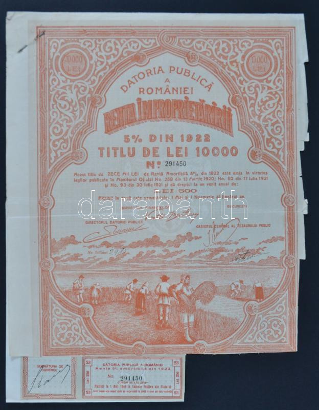 Romania 1922. Public Debt Bond about 10.000 Lei + 1945. Public Debt Bond about 100.000 Lei C:F,XF