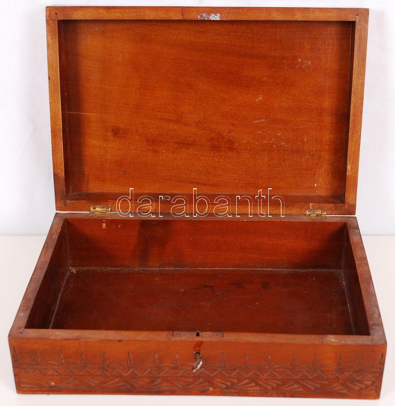 Leírás: Kézzel faragott, nagyméretű, régi fadoboz kulccsal /