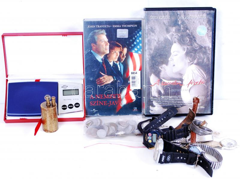 Leírás: Vegyes bolha tétel: Ékszermérleg, réz öngyújtó, 9db elemes karóra, 2 db műsoros videokazetta, 80 db vegyes érme, 19 db 5 filléres, egyebek
