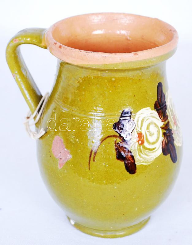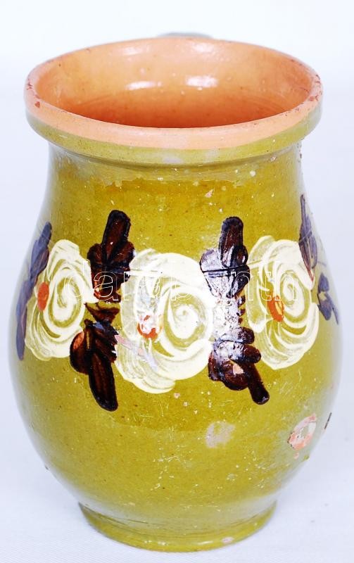 Leírás: Régi, mázas, népművészeti kerámiacsupor /