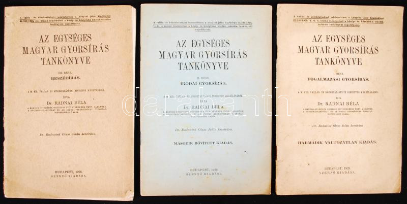 Leírás: Radnai Béla: Az egységes magyar gyorsírás tankönyve I.-III. kötet. Bp., 1928 Szerző kiadása.