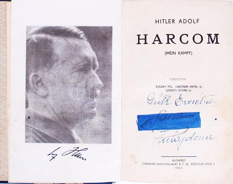Adolf Hitler: Harcom. Budapest 1935. Centrum Kiadóvállalat. Első fordítás, fordították: Kolbay Pál, Lindtner Antal dr., Szakáts István dr. Kis szakadás a gerincen