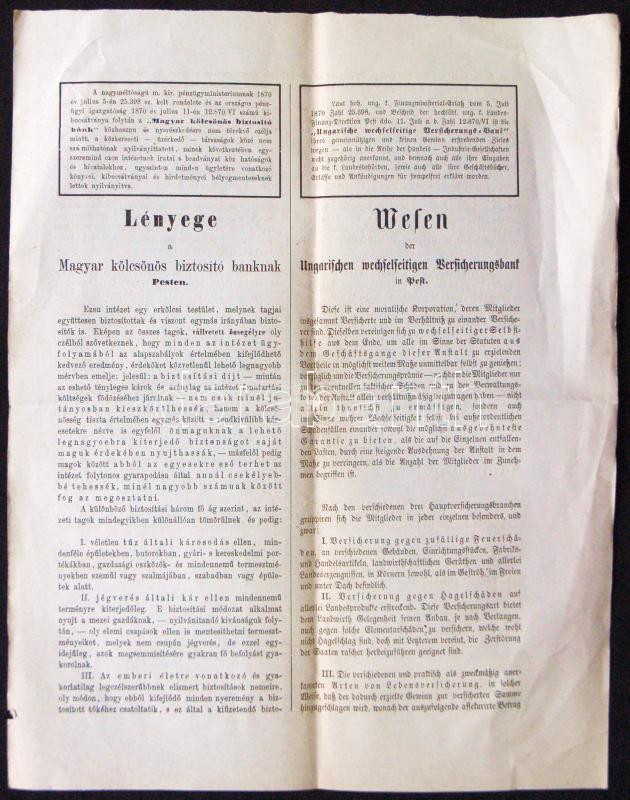Leírás: 1870 Magyar Kölcsönös Biztosító Bank kétnyelvű tájékoztató