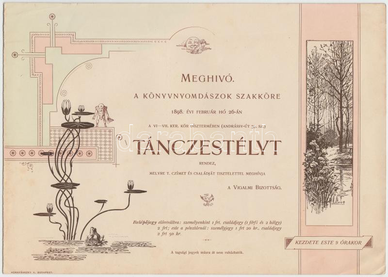 Leírás: 1898 Könyvnyomdászok szakköre táncestély szecessziós meghívó 26x18 cm