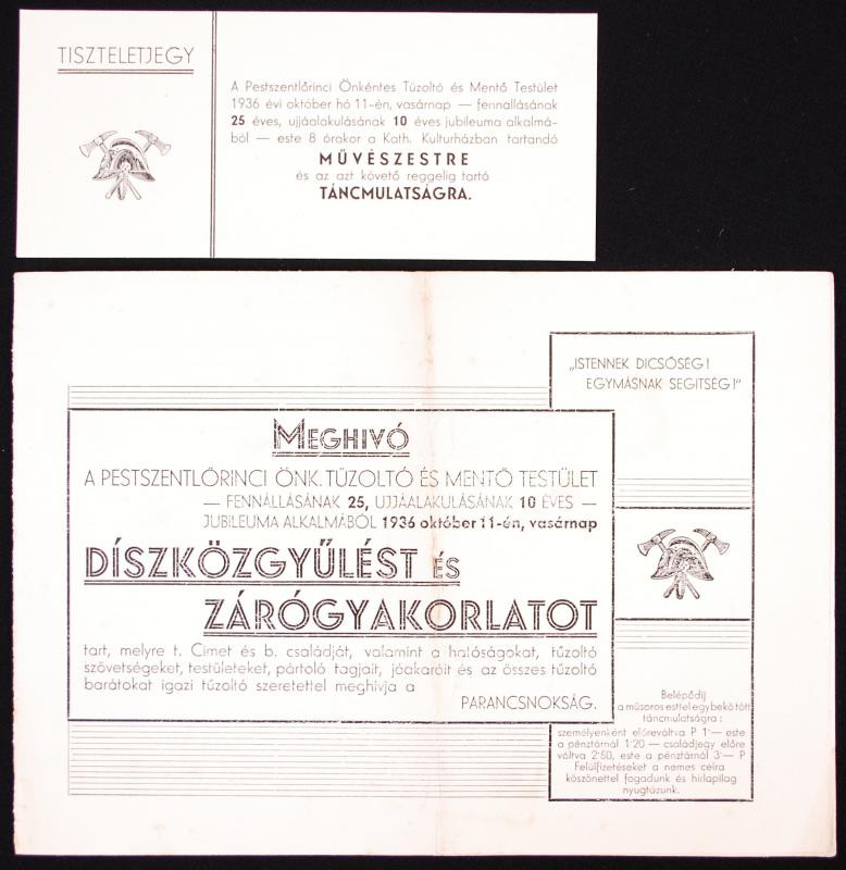 Leírás: 1936 Pestszentlőrinci önk. tűzoltó és mentő testület meghívója és programja díszközgyűlésre + tiszteletjegy