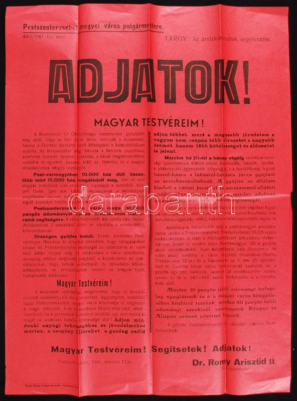 1941 Pestszentlőrinc városi hirdetmény az árvízkárosultak megsegítésér... https://www.darabanth.com/hu/183-Gyorsarveres/183.0/Festmeny-mutargy-papirregiseg-egyeb/Nyomtatvanyok~5200026/1941-Pestszentlorinc-varosi-hirdetmeny-az-arvizkarosultak-megsegitesere-46x60-cm~II656774