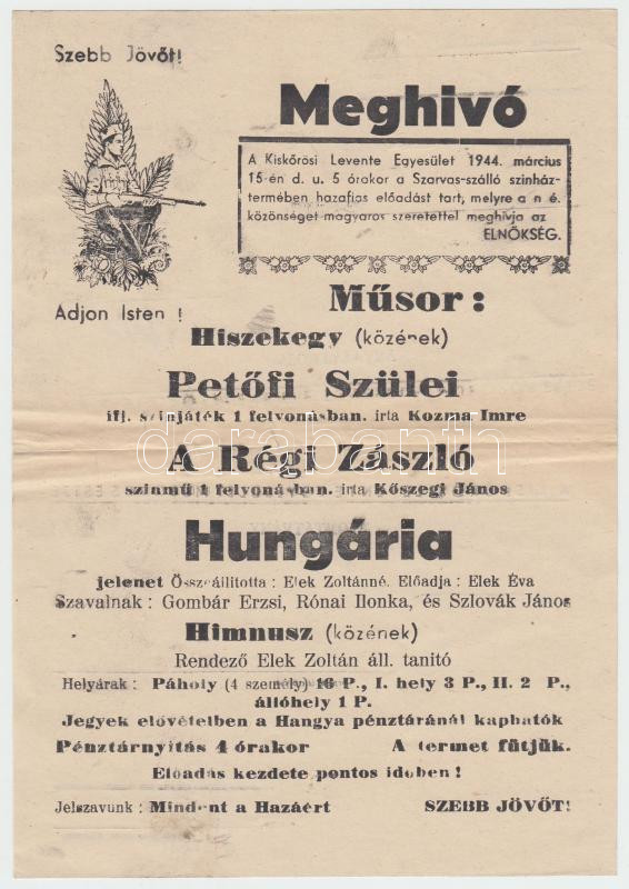 1944 Meghívó Levente-rendezvényre https://www.darabanth.com/hu/183-Gyorsarveres/183.0/Festmeny-mutargy-papirregiseg-egyeb/Nyomtatvanyok~5200026/1944-Meghivo-Levente-rendezvenyre~II656427
