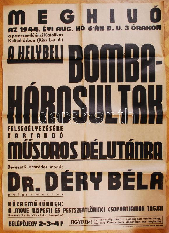 1944 Pestlőrinc meghívó plakát bombakárosultak javára rendezett segély... https://www.darabanth.com/hu/183-Gyorsarveres/183.0/Festmeny-mutargy-papirregiseg-egyeb/Nyomtatvanyok~5200026/1944-Pestlorinc-meghivo-plakat-bombakarosultak-javara-rendezett-segelymusorra-70x90-cm~II656727