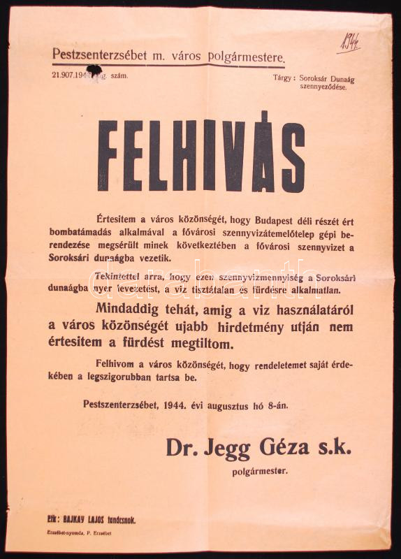 Leírás: 1944 Pestszenterzsébet községi felhívás, a Duna vizében való fürdés megtiltására 30x40 cm