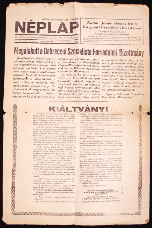 Leírás: 1956 A Néplap c. debreceni újság október 26.-i száma a forradalom híreivel, kissé megviselt állapotban