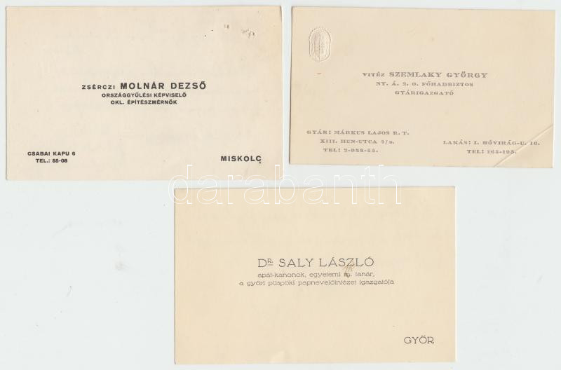 ismert emberek névjegyei: Szemlaky, Saly, Molnár https://www.darabanth.com/hu/183-Gyorsarveres/183.0/Festmeny-mutargy-papirregiseg-egyeb/Nyomtatvanyok~5200026/ismert-emberek-nevjegyei-Szemlaky-Saly-Molnar~II657113