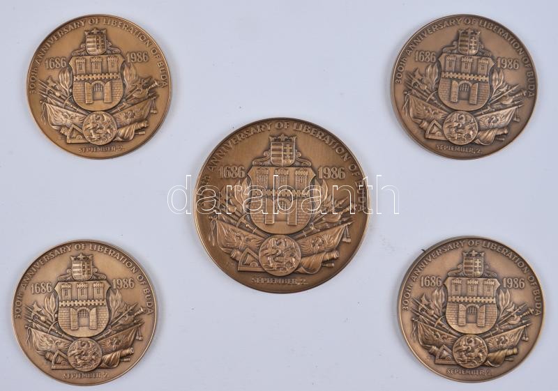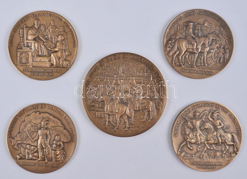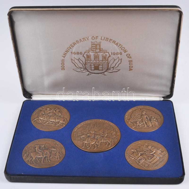 Bodó Sándor (1920-) 1986. "Buda felszabadításának 300. évfordulója" alkalmából az Amerikai Egyesült Államokban kiadott 5db klf nagyméretű aranyozott bronz emlékéremből álló komplett sorozata dísztokban! T:1