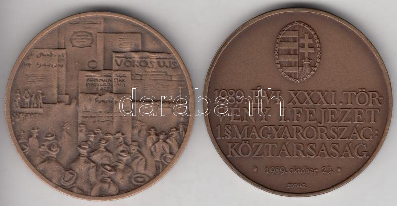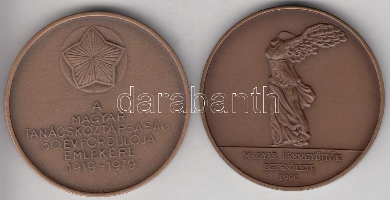 Leírás: Bognár György (1944-) 1990. "Köztársaság" Br emlékérem (42,5mm) T:1 + 1979. "Magyar Tanácsköztársaság 60. Évfordulója Emlékére 1919-1979" matt Br emlékérem eredeti plombált műanyag ÁPV tokban T:1