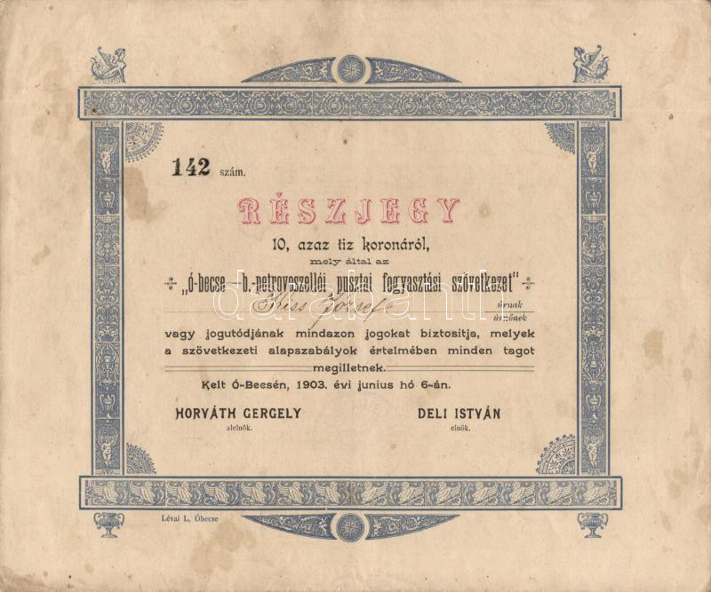 1903. "Ó-becse-b.-petrovoszellói Pusztai Fogyasztási Szövetkezet" rész... https://www.darabanth.com/hu/183-Gyorsarveres/183.0/Numizmatika/Reszvenyek-es-sorsjegyek~5200125/1903-O-becse-b-petrovoszelloi-Pusztai-Fogyasztasi-Szovetkezet-reszjegye-10K-rol-szelveny~II657500