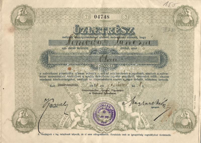 1920. "Jászárokszállási Hangya Fogyasztási és Értékesítő Szövetkezet" ... https://www.darabanth.com/hu/183-Gyorsarveres/183.0/Numizmatika/Reszvenyek-es-sorsjegyek~5200125/1920-Jaszarokszallasi-Hangya-Fogyasztasi-es-Ertekesito-Szovetkezet-uzletreszjegy-50K~II657508