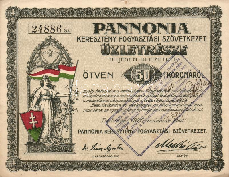 1920. "Pannonia Keresztény Fogyasztási Szövetkezet" üzletrésze 50K-ról... https://www.darabanth.com/hu/183-Gyorsarveres/183.0/Numizmatika/Reszvenyek-es-sorsjegyek~5200125/1920-Pannonia-Kereszteny-Fogyasztasi-Szovetkezet-uzletresze-50K-rol-szelvenyekkel-TIII~II657454