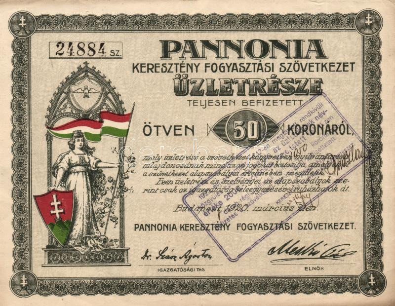 1920. "Pannonia Keresztény Fogyasztási Szövetkezet" üzletrésze 50K-ról... https://www.darabanth.com/hu/183-Gyorsarveres/183.0/Numizmatika/Reszvenyek-es-sorsjegyek~5200125/1920-Pannonia-Kereszteny-Fogyasztasi-Szovetkezet-uzletresze-50K-rol-szelvenyekkel-TIII~II657456