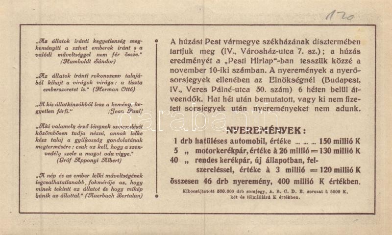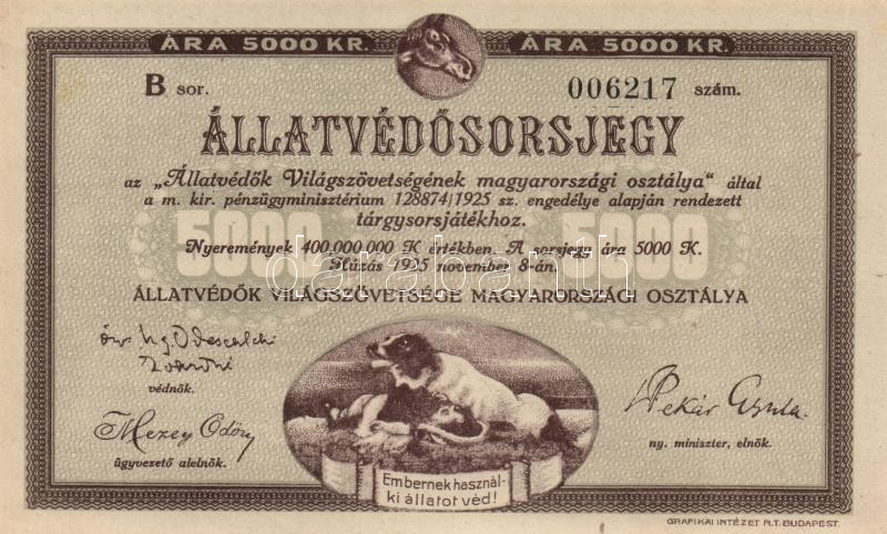 1925. "Állatvédősorsjegy / Állatvédők Világszövetségének magyarországi... https://www.darabanth.com/hu/183-Gyorsarveres/183.0/Numizmatika/Reszvenyek-es-sorsjegyek~5200125/1925-Allatvedosorsjegy-Allatvedok-Vilagszovetsegenek-magyarorszagi-osztalya-sorsjeg~II657926