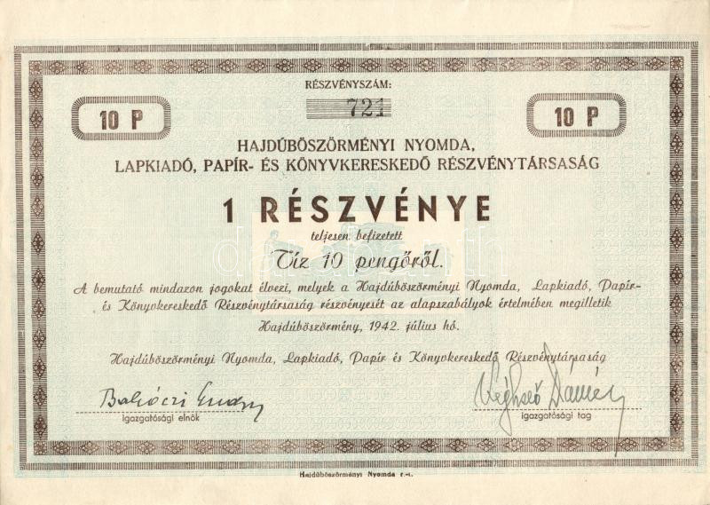 Leírás: Hajdúböszörmény 1942. "Hajdúböszörményi Nyomda , Lapkiadó, Papír-és Könyvkereskedő Részvénytársaság" részvénye 10P-ről szelvényekkel T:II