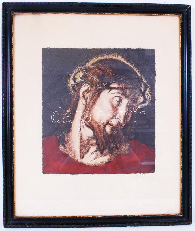 Leírás: Vidai Brenner Nándor (1903-1944): Krisztus a töviskoronával. Színezett rézkarc, papír, jelzett, üvegezett keretben 53×45 cm