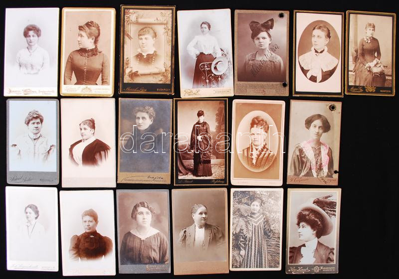 Leírás: 1880-1900 19db keményhátú portréfotó nőkről különféle műtermekből, vizitkártya méretben /