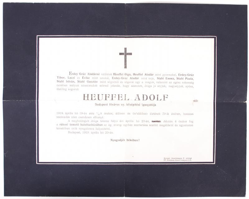Leírás: 1919 Heuffel Adolf, Budapest főváros nyugalmazott középítési igazgatójának gyászjelentése