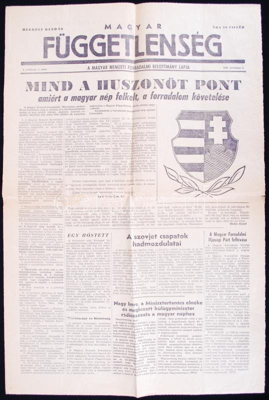Leírás: 1956 A Magyar Függetlenség c. lap november 2.-i száma a forradalom híreivel