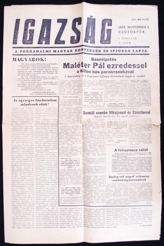 Leírás: 1956 Az Igazság c. lap november 1.-i száma a forradalom híreivel