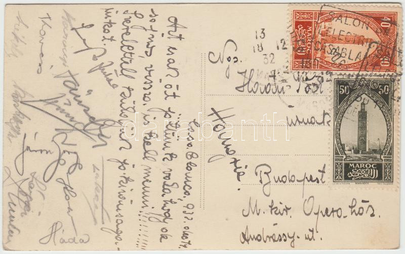 Leírás: 1932 A ferencvárosi futballcsapat üdvözlő képeslapja Casablancából a tagok aláírásával (Székely, Háda, Korányi stb.)