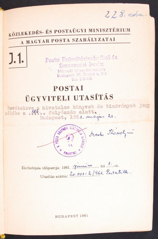A Magyar Posta Szabályzatai: Postai ügyviteli utasítás. Bp., 1961, Közlekedés- és Postaügyi Minisztérium. Kiadói félvászon kötésben, mellékelve háború (1945) előtti postai nyomtatványminták