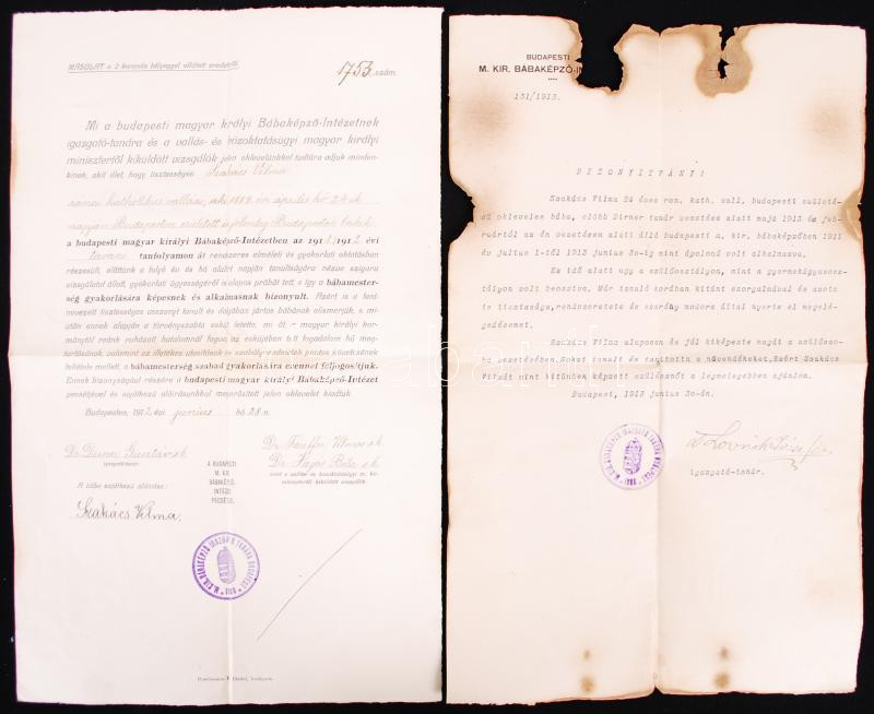 Leírás: cca 1930 Bábaképző 4 db bizonyítványa