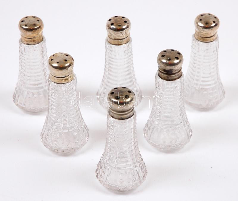 Leírás: 6db metszett üveg sótartó, jelzett, sterling ezüst (Ag) fejjel /