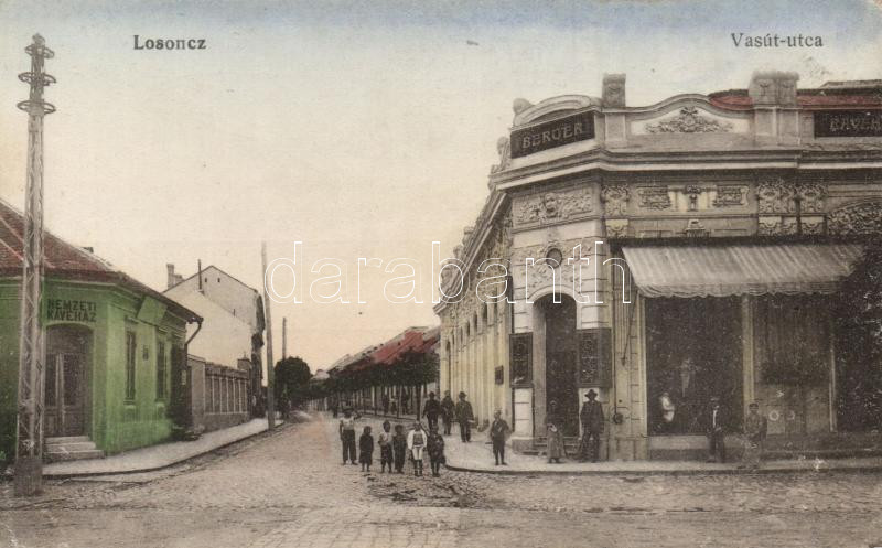Losonc Vasút utca / street, Café National, Berger's shop (fl) https://www.darabanth.com/hu/185-Gyorsarveres/185.0/Kepeslapok/Felvidek~400008/Losonc-Vasut-utca-street-Cafe-National-Bergers-shop-fl~II678734