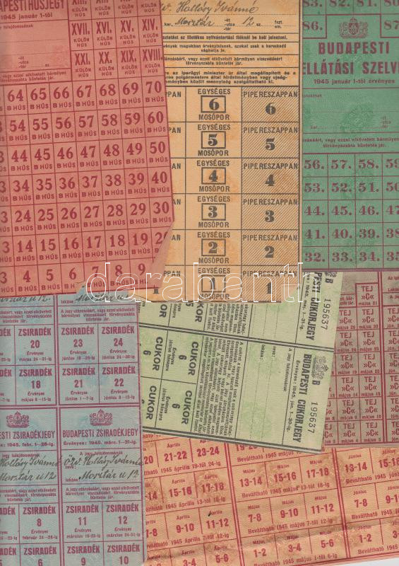 Leírás: Budapest 1945. szappanjegy, húsjegy, közellátási szelvényív, zsiradékjegy, cukorjegy, tejjegy, kenyérjegy (7db)