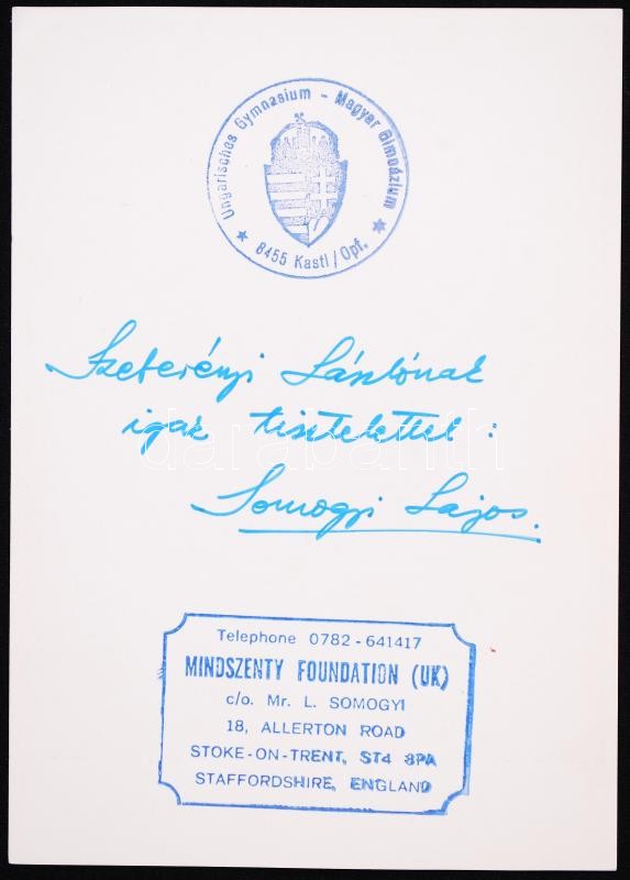 Leírás: Mindszenty József fényképe aláírással, az angliai Magyar Gimnázium pecsétjével