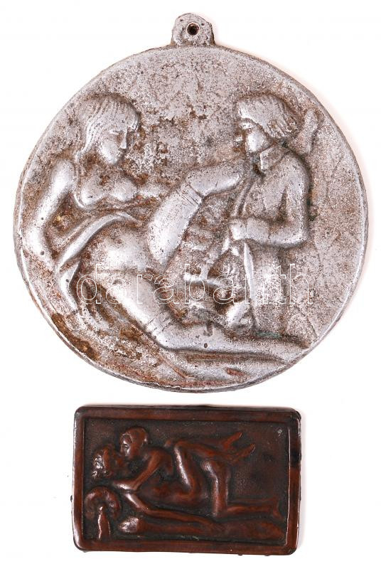 2db, erotikus jelenetet ábrázoló alumínium, illetve réz plakett /