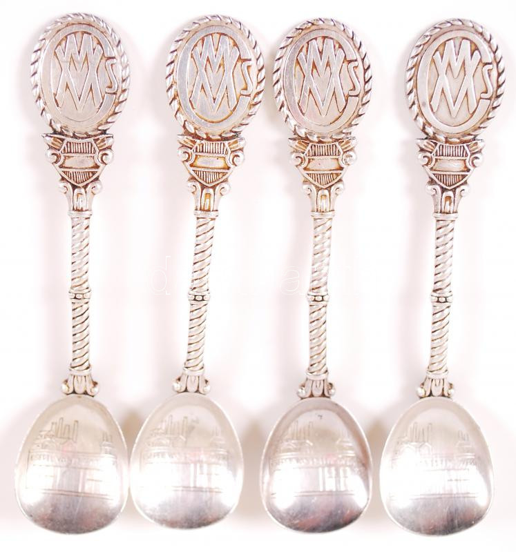 Leírás: 4 darab ezüstözött, díszített kiskanál, "Csepel Vas és Fémművek" felirattal