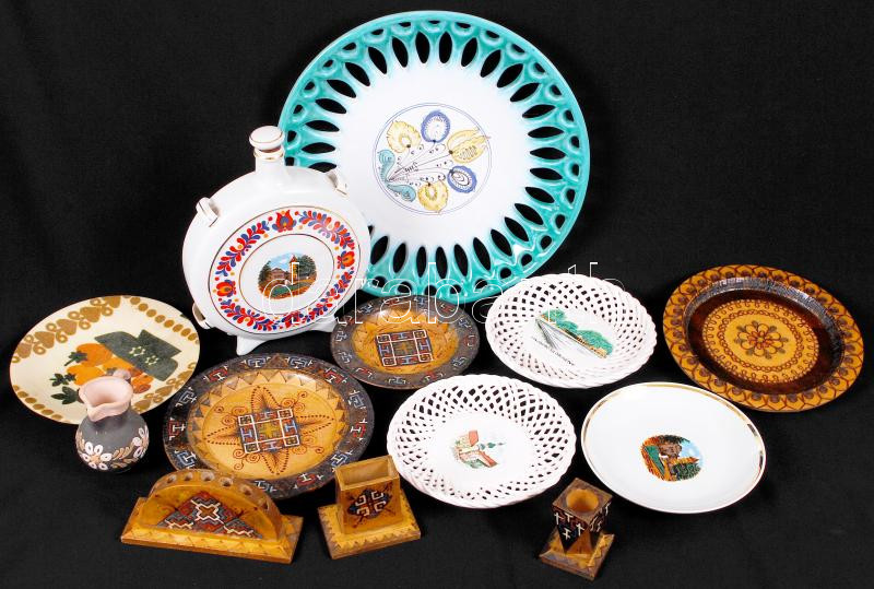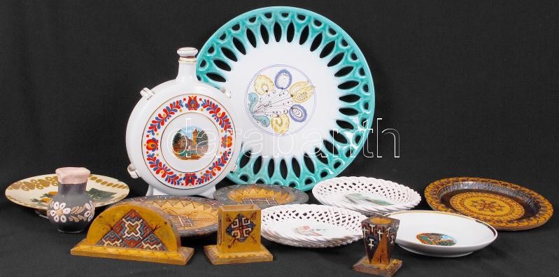 Leírás: Bolha tétel: kistányérok, kiskancsó + Hollóházi kulacs Kőszeg látképpel, jelzett, hibátlan + kézi festésű áttört kerámia dísztányér d:28 cm + Faragott, kézi festett díszítőelemek, Vasfüggöny darab (garancia nélkül)