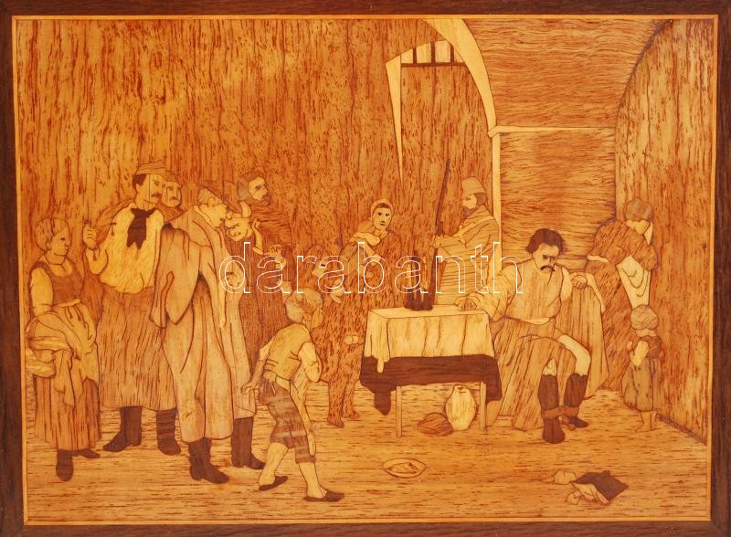 Leírás: Munkácsy Siralomház reprodukció, fa intarzia, nyomott, sérült keretben, 26×30 cm