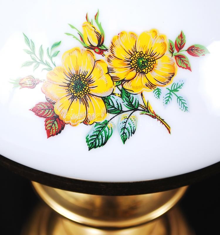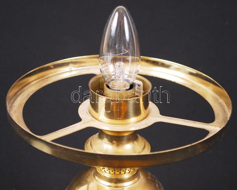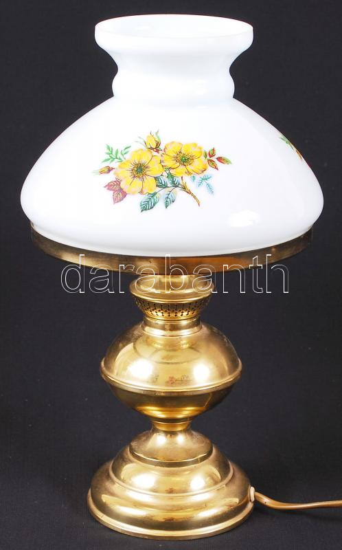 Leírás: Petróleumlámpa formájú, modern, elektromos éjjeli lámpa rézből, virágokkal díszített, tejüveg burával /