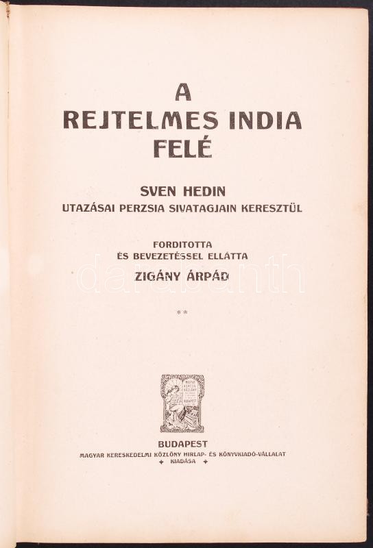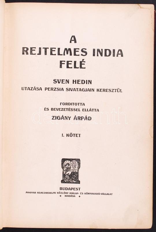 Sven Hedin: A rejtelmes India felé I-II. Ford., bev. Zigány Árpád. Bp., é.n., Magyar Kereskedelmi Közlöny Hirlap- és Könyvkiadó-Vállalat. Kiadói, dombornyomott, festett, aranyozott egészvászon kötésben, fotókkal és rajzokkal gazdagon illusztrálva (I. kötet gerince sérült)