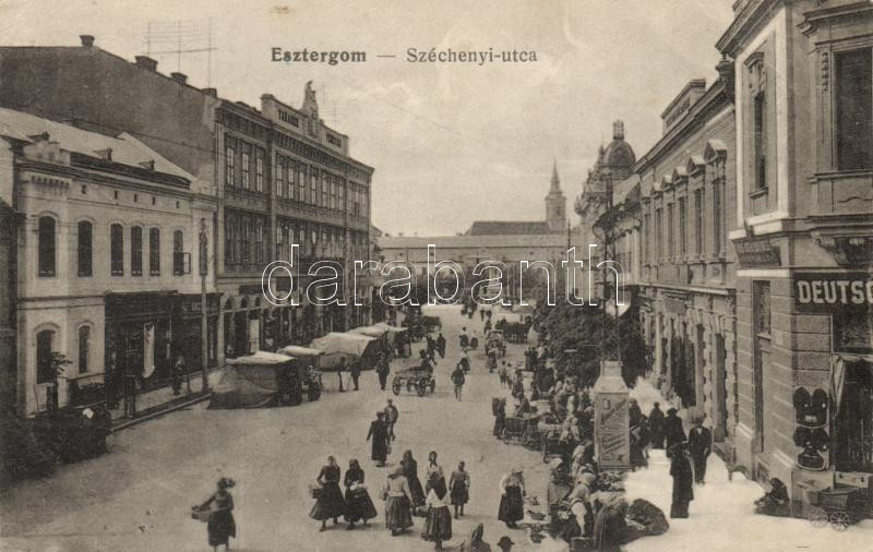 Esztergom Széchenyi utca, Deutsch üzlete, piac (fa) https://www.darabanth.com/hu/186-Gyorsarveres/186.0/Kepeslapok/Magyarorszag~8000010/Esztergom-Szechenyi-utca-Deutsch-uzlete-piac-fa~II683378